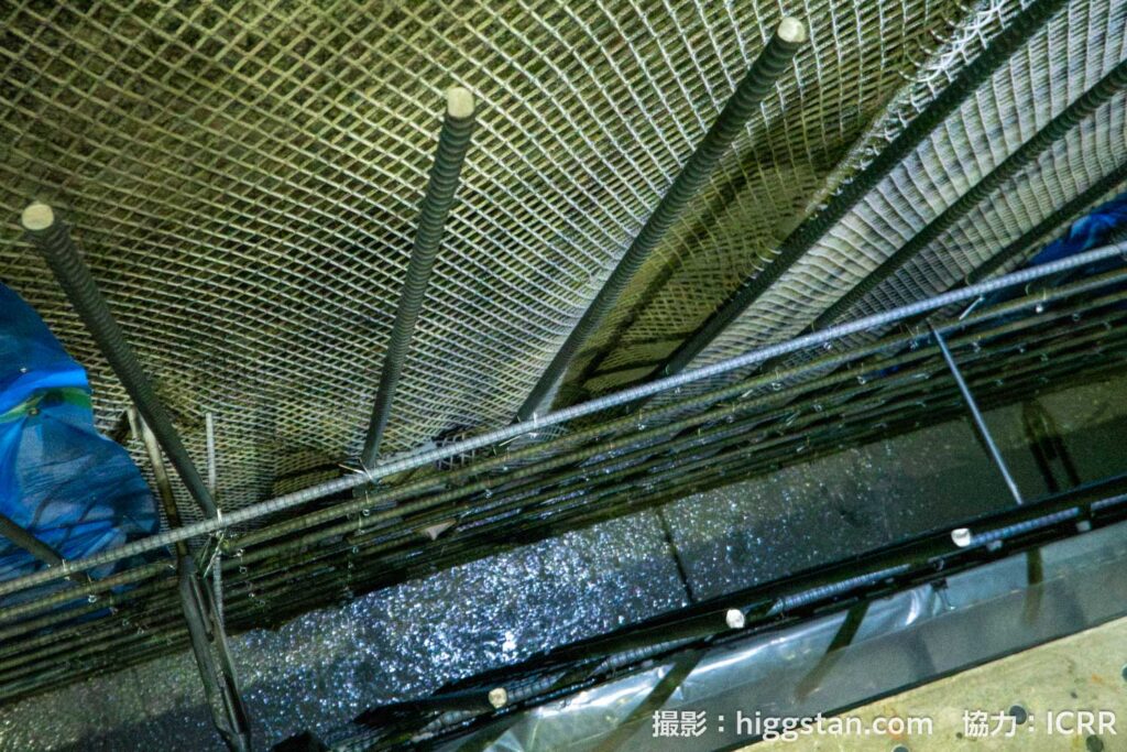 鉄筋の間から下を覗き込んでみると、どろどろしたものが見えました。これが、固まる前の生コンクリートです。鉄骨にステンレス板を固定し、ステンレス板と岩盤の間にコンクリートを流し込むことで(いわゆる鉄筋コンクリート)、とても頑丈な水槽の壁面を作ることができるんです。