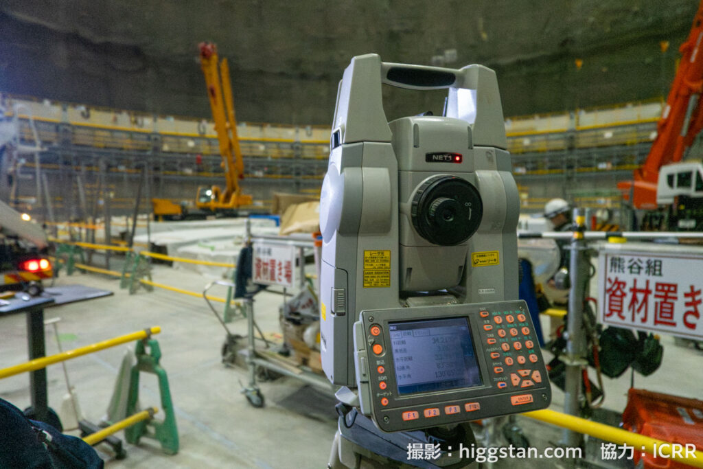 もちろん、ステンレス板を適当な位置に取り付けていては、26万トンもの巨大な水槽を造ることはできません。中心からの距離を正確に測り、正しい位置にステンレス板がくるように設置する必要があります。そのため、空洞の中央に測量器が設置されています。