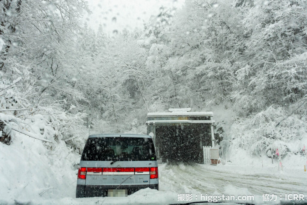 見慣れている坑道の入口も、雪で埋もれて少し新鮮…なのですが、それ以上に大変だったのが、坑道の入口までの道路です。実際に、関係者の方の車が山道の途中でスタックしてしまい、しばらく入口までたどり着けなくなってしまう場面もありました。雪道、怖い。