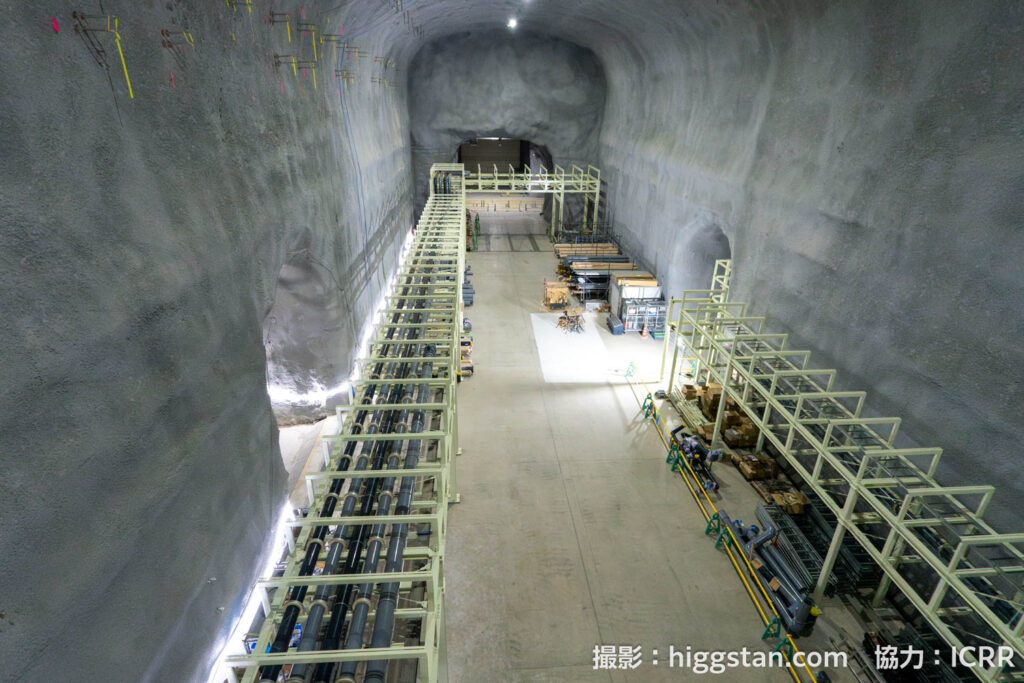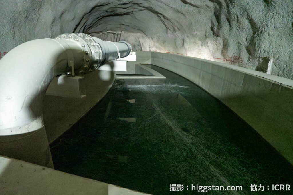 部屋の奥にある鉄骨の建物の中では、超純水を作るための装置が準備されていました。スーパーカミオカンデにも同様の装置はありますが、ハイパーカミオカンデで必要な超純水の量は、なんとスーパーカミオカンデの5倍以上。その膨大な量に対応するために、装置のサイズもぐんっと大きくなっています。