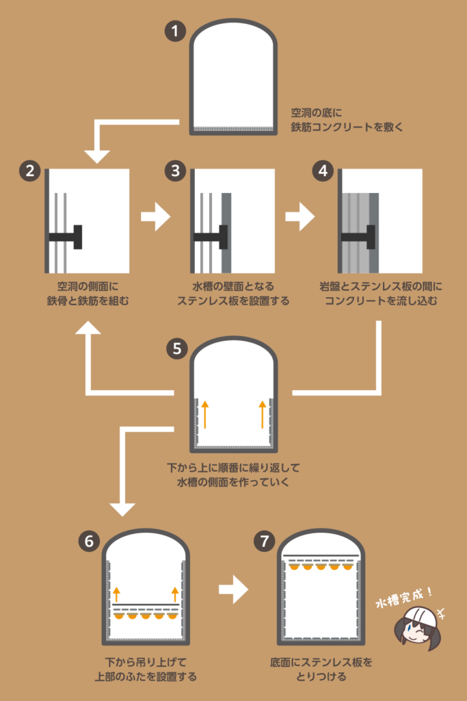 とっても硬い岩盤を掘削してできた、直径69メートル、高さ73メートルもの巨大な円筒形の空間。そこに、どうやって水槽を造っていくのでしょうか…?その大工事の流れを、とってもおおざっぱにまとめると次のようになります。