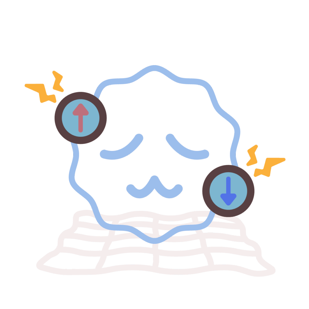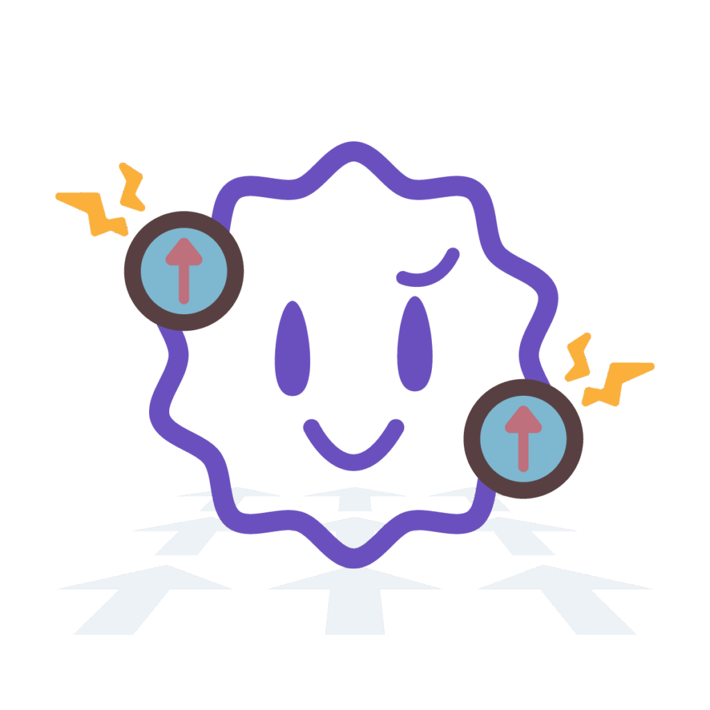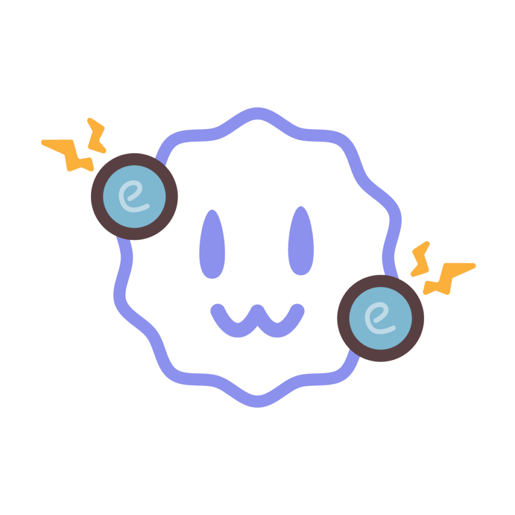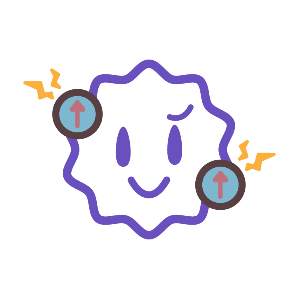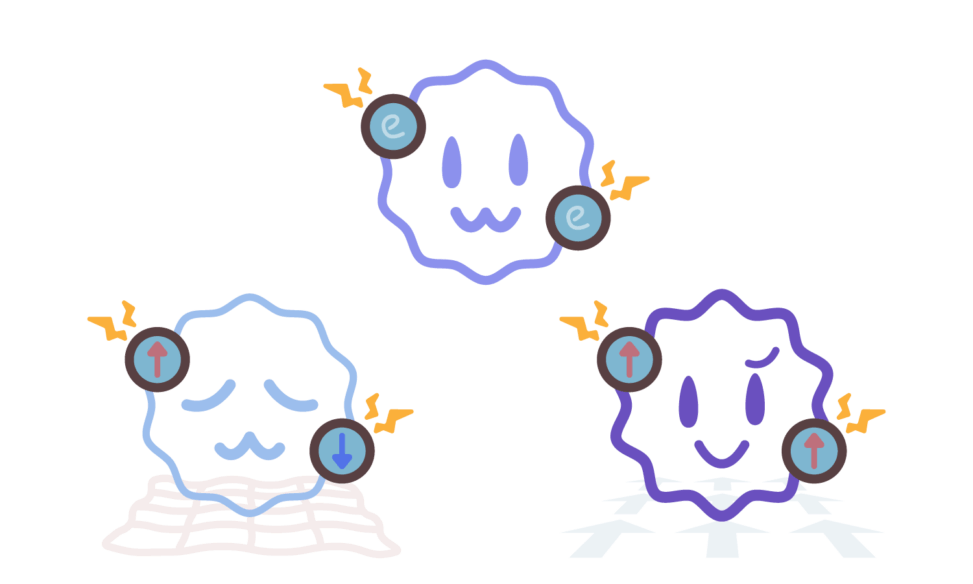 電子が2個つながってボソンのようにふるまうクーパー対。超伝導現象ととっても深い関係の子です。そんなクーパー対のイラストと、電子のスピンが逆向きのシングレット、同じ向きのトリプレットのイラストです。かわいく使ってね。