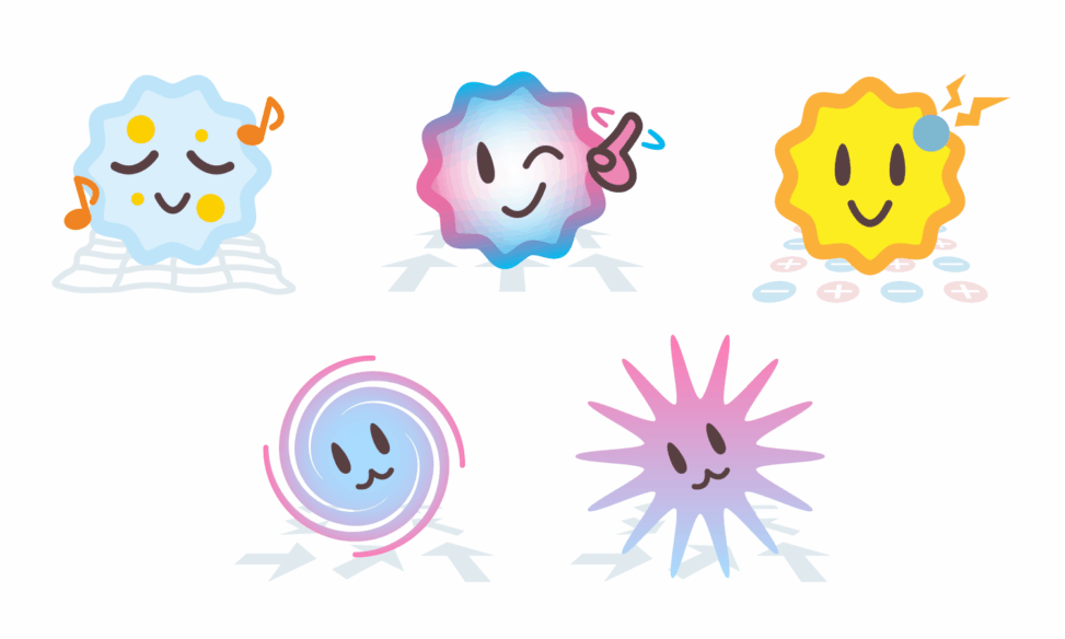たくさんのものが集まって動くと、まるでひとつの粒子のように見えることがあります。そんな準粒子たちのかわいいイラストです。よかったら使ってね。