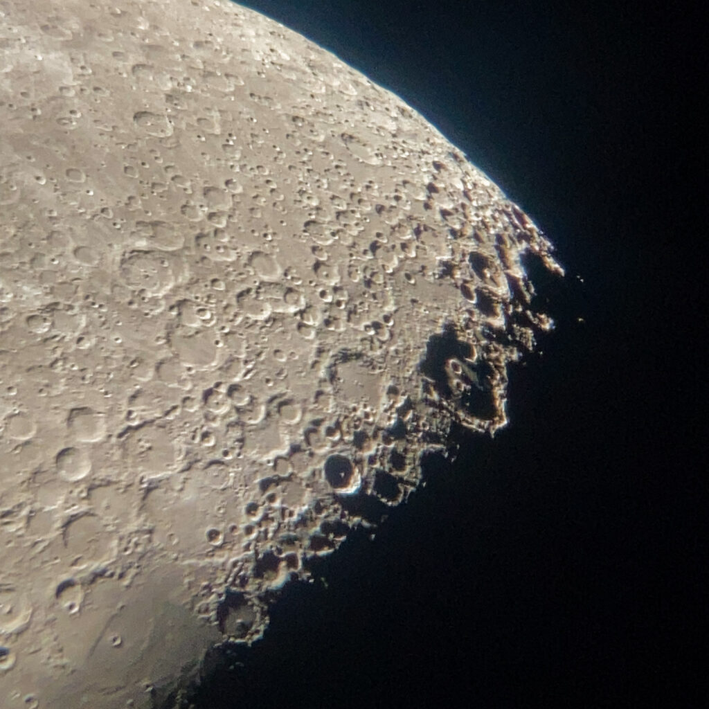 ちょうど半月に近いタイミングだったこともあり、明るい部分と暗い部分の境界では、クレーターの凸凹がとってもはっきり見えています。