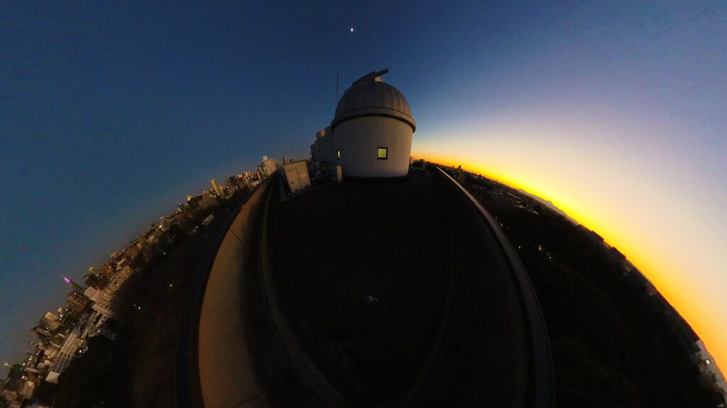 天体観測ドームの近くを、360度カメラで撮影してみました。ちょうど夕暮れ時のビル群がとってもきれいです。遠くには富士山も見えています。