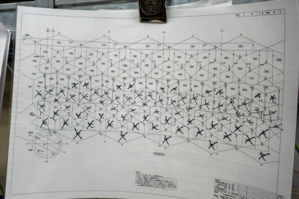 約1900個もの光電子増倍管を取り外すこの大作業、もちろん無計画には進められません。どのブロックの光電子増倍管がすでに取り外されたのか、これから作業するのはどこなのか、そんな情報を整理するためのマップがありました。ひとつひとつの作業がていねいに進められていることが伝わってきます。