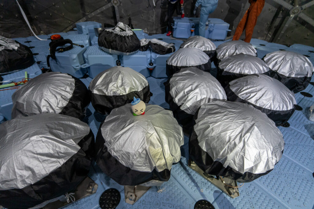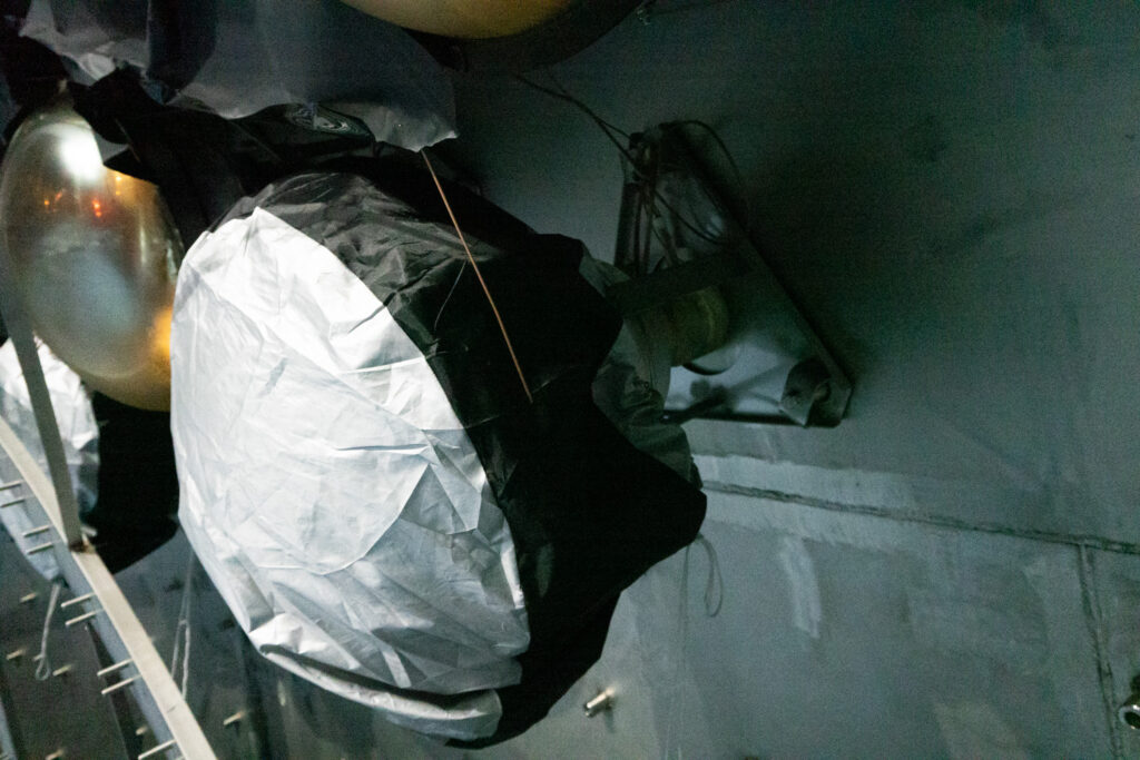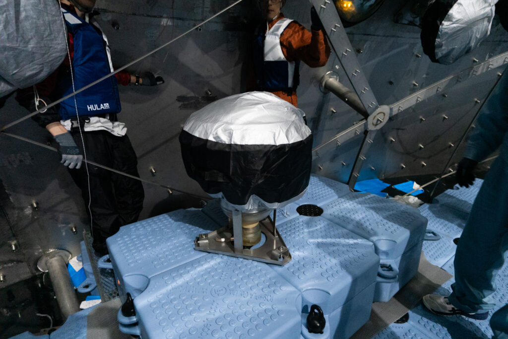 いろいろな作業を終えて、ゴンドラで球体タンクの外に上がっていくようすも撮影しました。水色の足場や壁面の光電子増倍管から遠ざかっていく光景は、すごく不思議な感覚を覚えてしまいます。