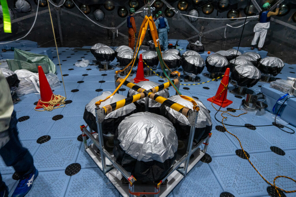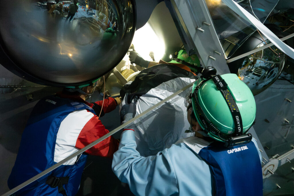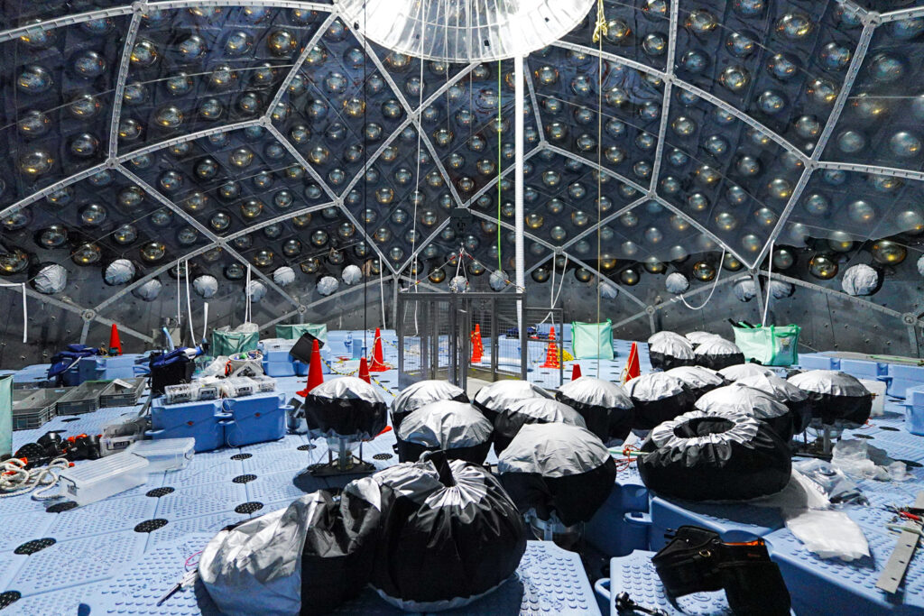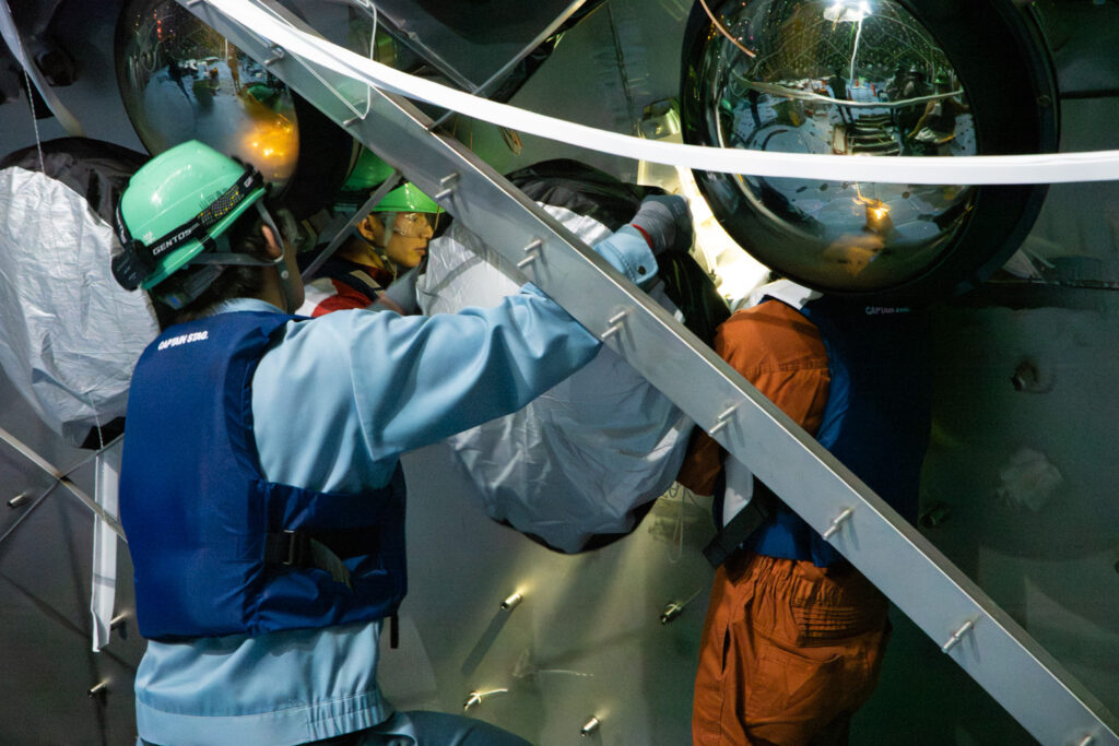 球体タンクの内側に取り付けられた約1900個の光電子増倍管を取り外す作業は、今回の改修工事における大きなマイルストーンのひとつです。この作業が完了すると、これまでのKamLANDのなごりを少しずつ手放しながら、いよいよKamLAND2へと歩みを進める段階に入っていきます。