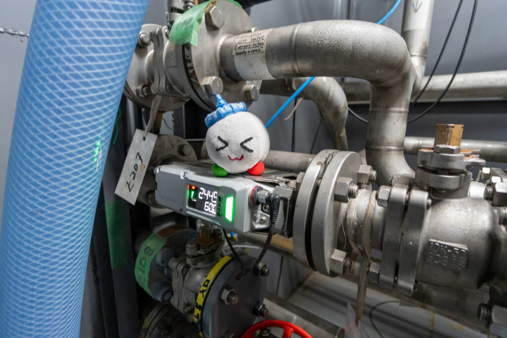 以前の記事で、球体タンクの中に入っていたオイルを排出するためのラインの写真を紹介したことがありましたが、今回はその同じラインを使って水を入れているんです。