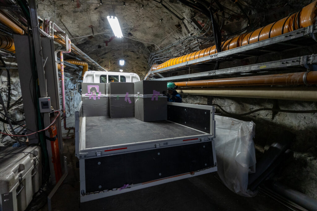 箱に詰められた光電子増倍管は、いよいよKamLANDの実験装置のある空間からその外へ、トラックで運び出されます。