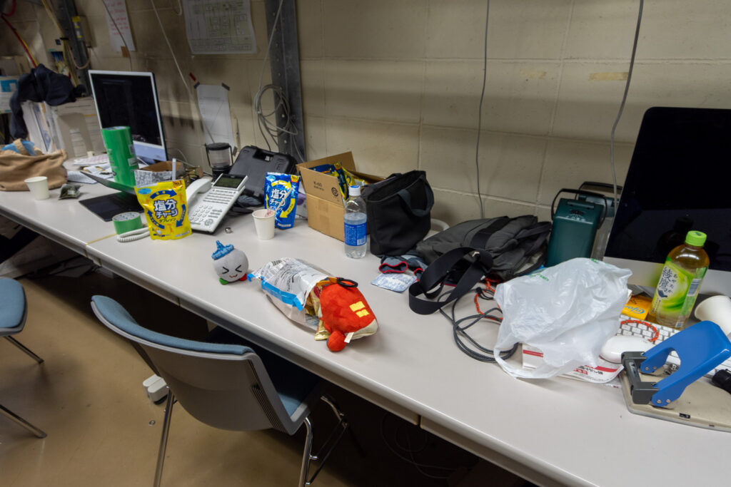 光電子増倍管を取り外す作業は、気力も体力もとっても使います。そんな現場では「しっかり休むこと」もとっても大事!坑内のとある部屋には、作業の合間にひと息つけるように、お菓子や飲み物が置いてありました。おいしそう。