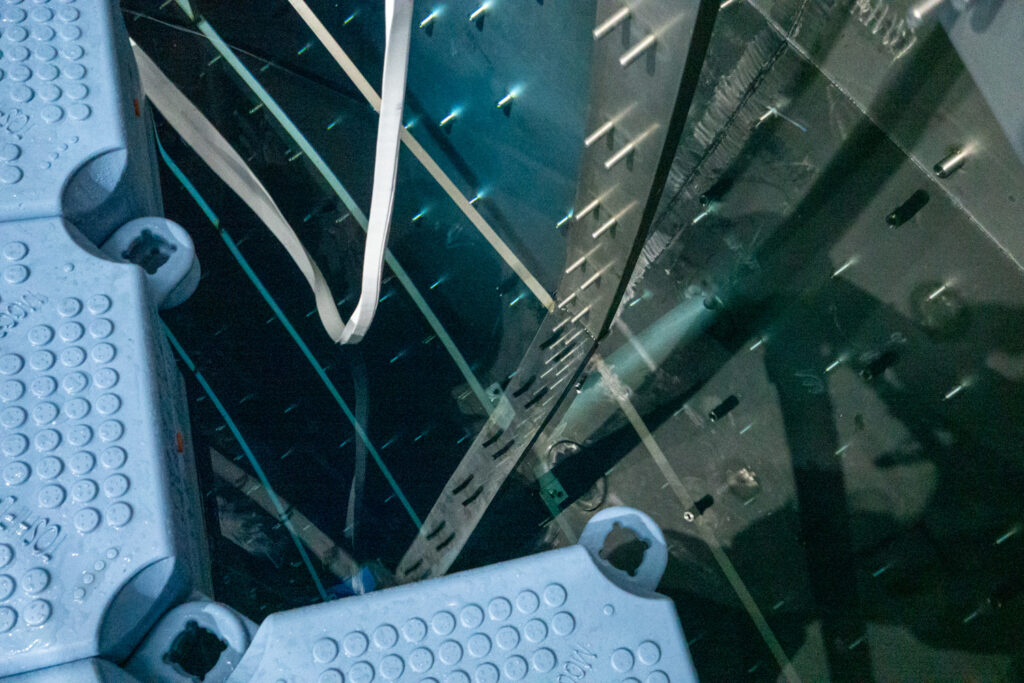 タンクの端の方に行ってみると、フロートの下が水で満たされているのがわかります。スーパーカミオカンデのタンクでも感じたんですが、水って、ちゃんと青く見えるんですよね。