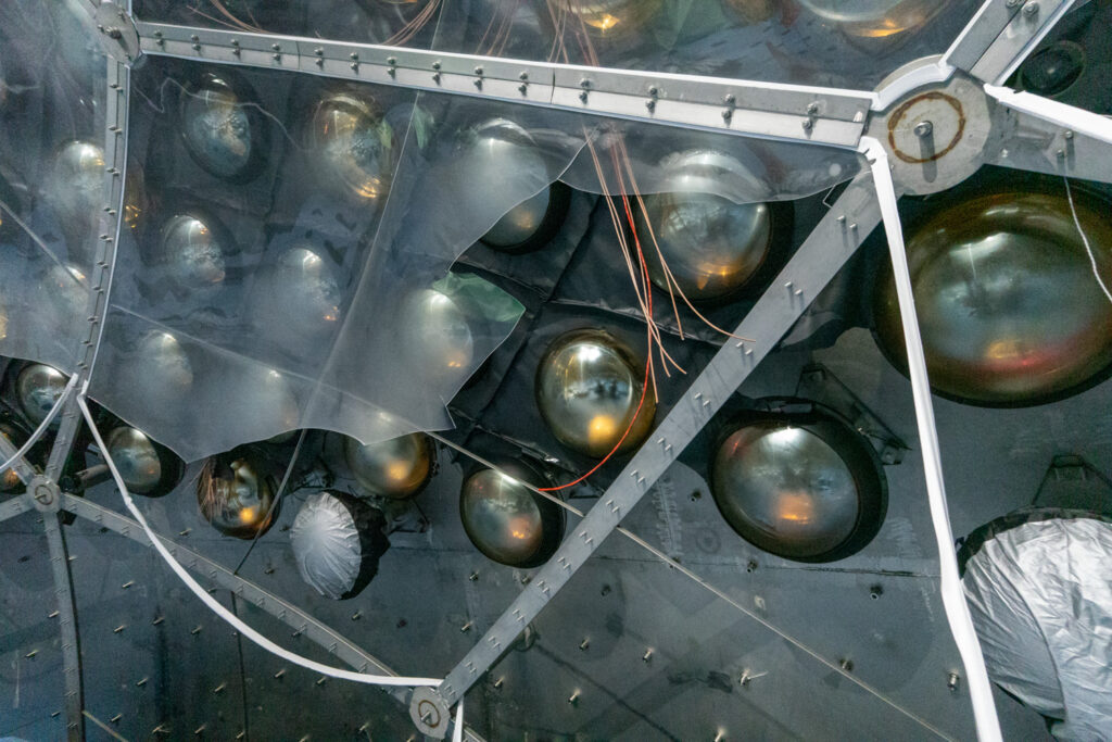 こちらが、球体タンクの壁面に取り付けられている光電子増倍管です。今回の改修では、性能の良い新しいものに交換するために、すべての光電子増倍管が取り外されることになっています。