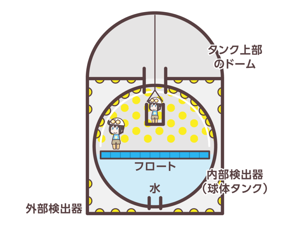 直径18メートルの球体の内側に並んでいる光電子増倍管を、そのままの状態で外すのはちょっと大変。そこで、まずタンクに水を入れ、その水面にフロート(浮く足場)をぷかぷか浮かべます。作業の人たちはそのフロートに乗って、光電子増倍管をひとつひとつ取り外していくのです。
